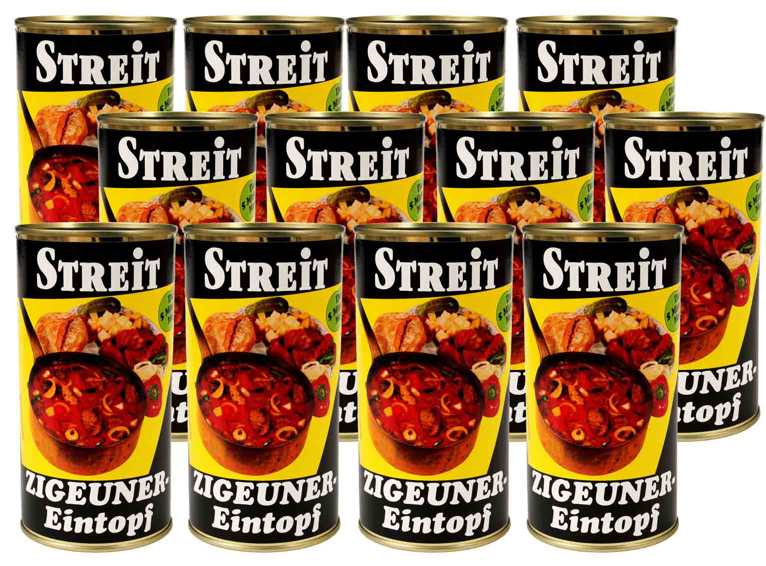 Zutaten: Trinkwasser, Schweinefleisch (10%), Zwiebeln (10%), Kartoffeln (9%), Erbsen, Karotten, Tomatenmark,